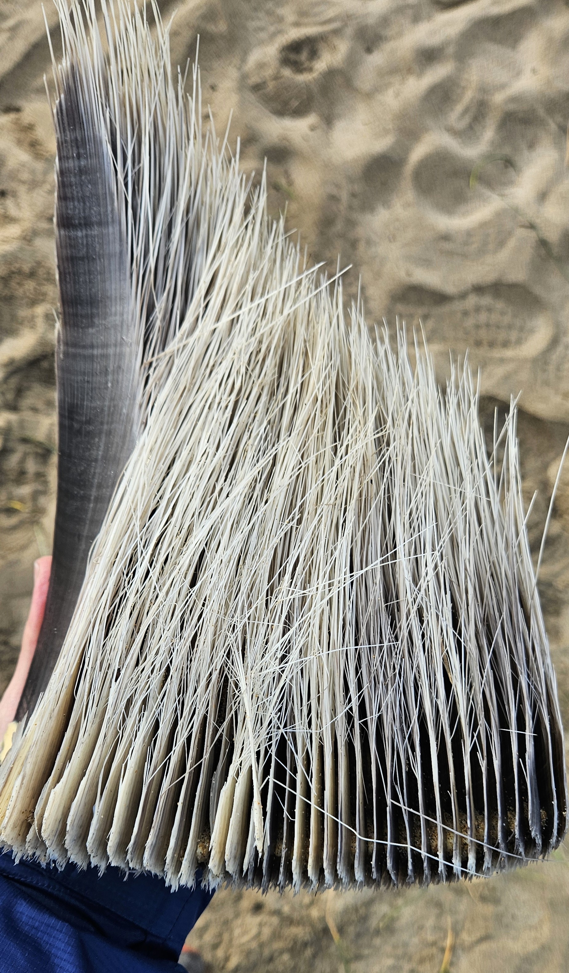 Garth, who was teaching tracking classes here the day prior, had stashed our first mystery by the beach entrance: a piece of a baleen plate. We examined its fibrous bristles, made of keratin—the same material as human hair and fingernails—and discussed its function. These long, flexible plates grow from the upper jaws of certain whale species and are lined with fine, hair-like fringes that filter small organisms like krill and plankton from seawater. As we ran our fingers along its intricate grooves, we wondered what species of a whale it belonged to. Regular visitors to the beach recalled that a humpback whale had washed ashore last summer whose likely remnants were still decomposing just beyond the lagoon. But before reaching that discovery, there were other puzzles to solve.