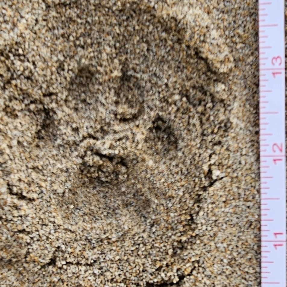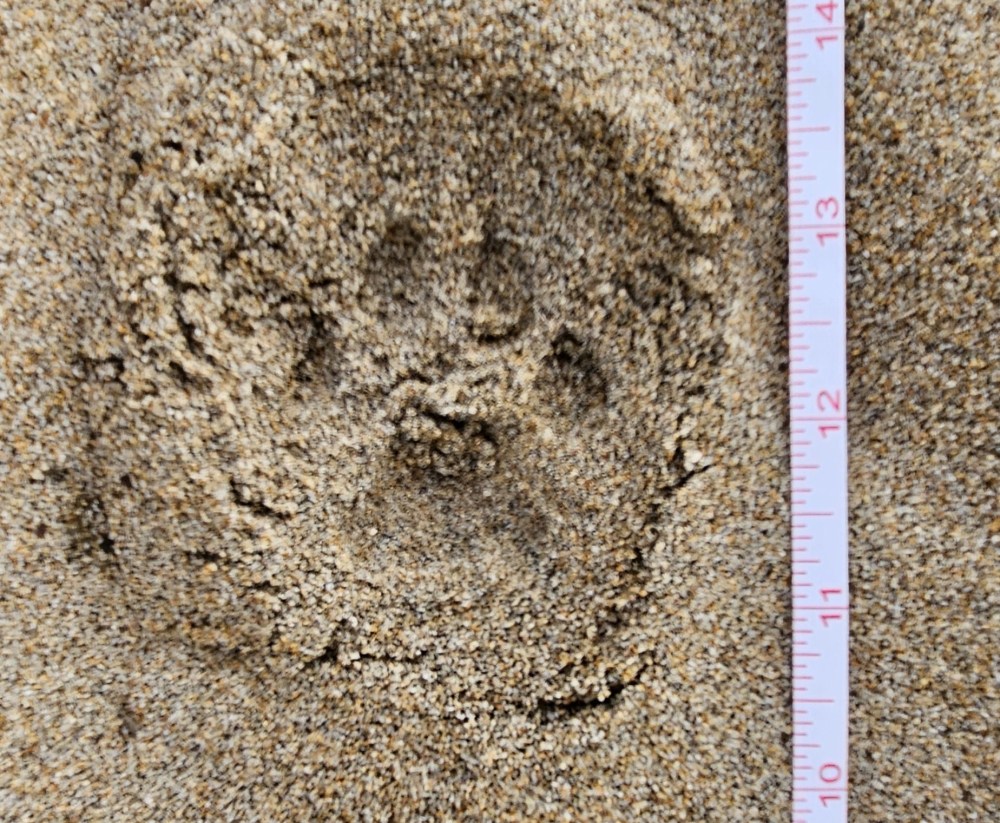 Along the edge of the beach, we found a trail of tracks leading along the dunes toward the beach entrance. Each print was round, with four toes and a wide trapezoidal palm pad marked by three distinct lobes at the rear – a bobcat’s signature was unmistakable. But as we delved deeper, we discovered another set of tracks, similar yet subtly different. The palm pads were smaller, and there were tiny claw marks – both clues that these tracks belonged to a gray fox, which must have passed by earlier. We had barely stepped onto the beach, and already discovered evidence of a marine giant and two mesopredators that had visited the beach before us.