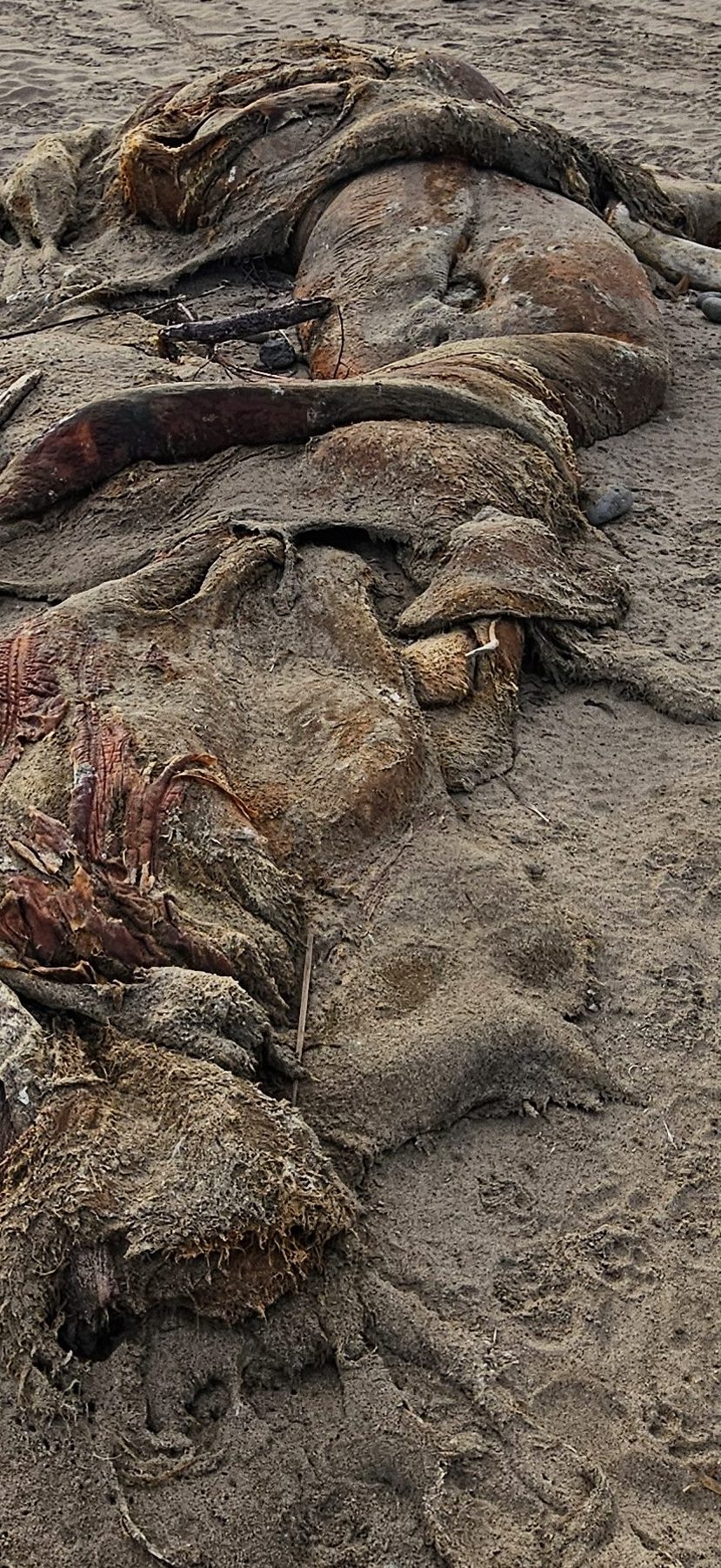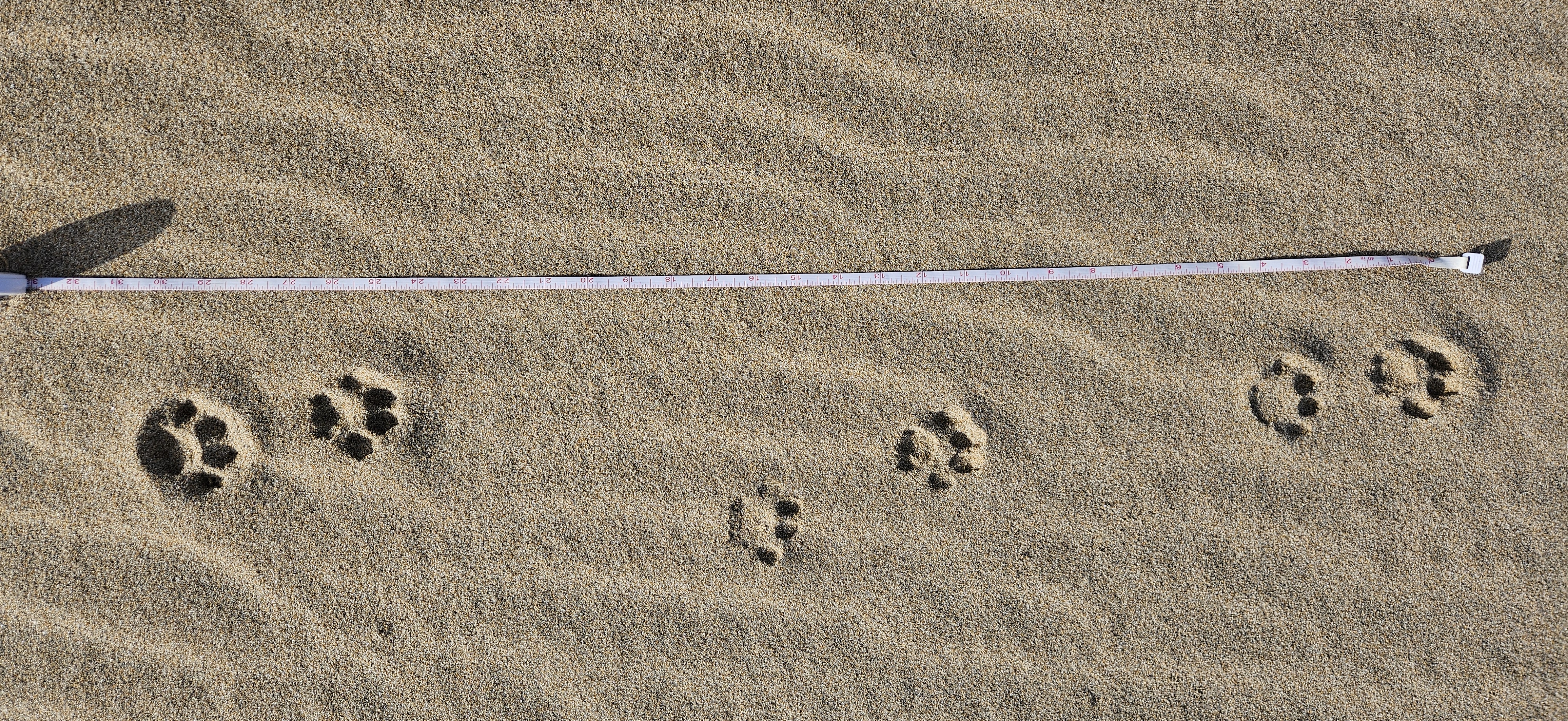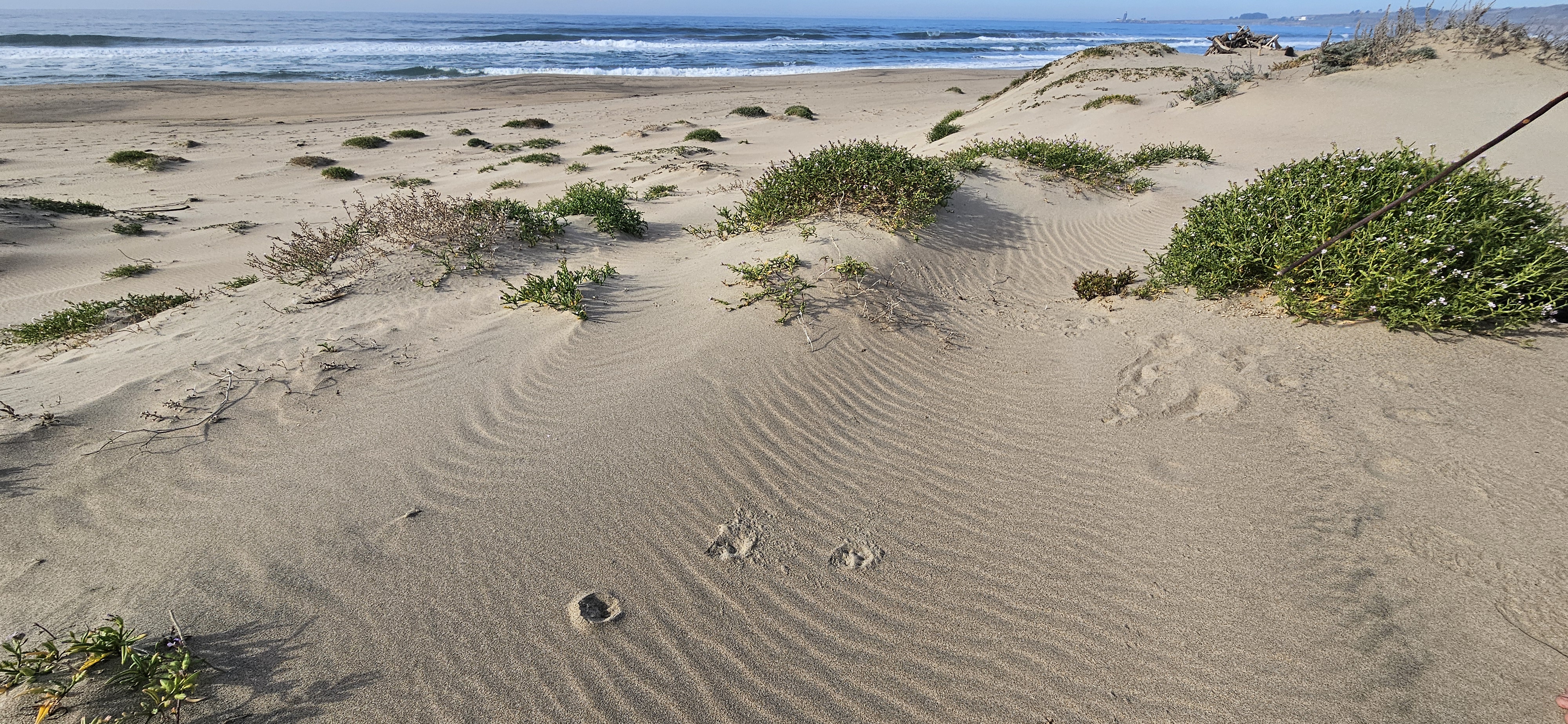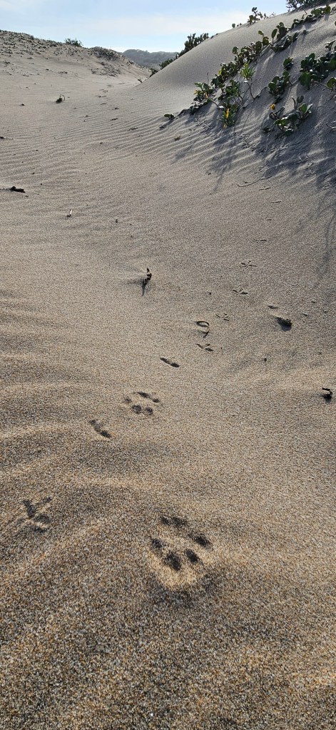 Just on the other side of the lagoon we found the remains of a whale. There was little left to glean about its fate from the twisted and sun-bleached skin and blubber, yet the scene was alive with activity. Tracks, crisscrossing and weaving, told of scavengers drawn to the carcass. Among them, two sets of canine prints stood out, their paths direct and purposeful. Though some prints were splayed with larger claw marks, the directness of the trail and the stride length hinted at coyotes, their claws digging into the sand and palm pads barely registering as they trotted across the beach. We backtracked them while trying to estimate the time of their visit.