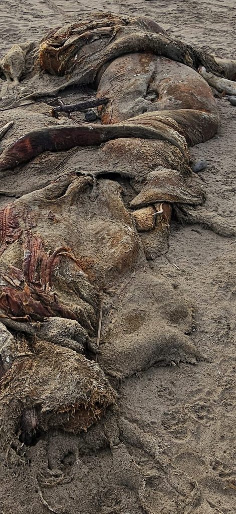 An earlier version of this story suggested the baleen plate and whale remains belonged to a gray whale. While it is difficult to determine the species, there was a record of a humpback whale that had washed ashore last June, and random pieces of a whale carcass had been found along the shore since then.