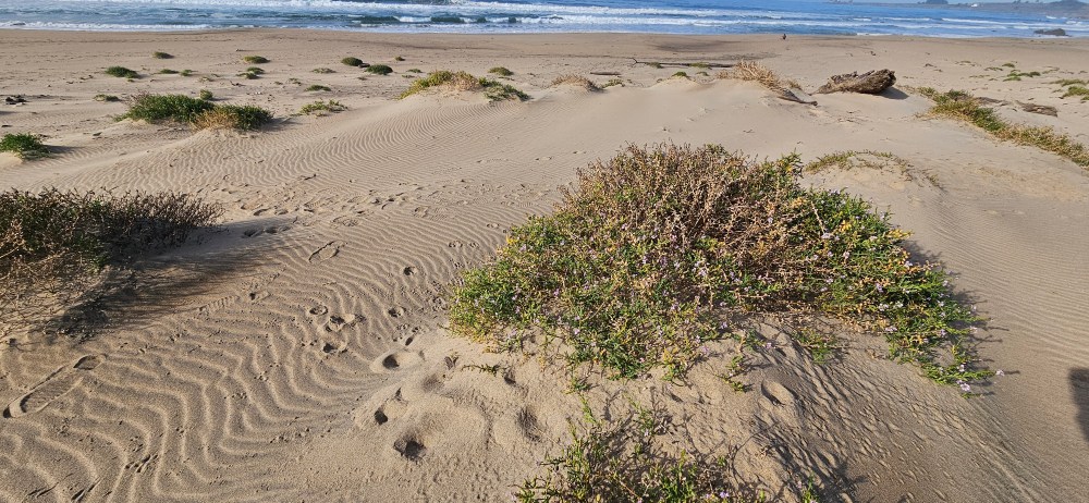 The dunes themselves held even more stories. Among them were round tracks with large palm pads pressed firmly into the sand—unmistakably those of a bobcat. Its smaller, symmetrical hind tracks appeared ahead of the larger ones, indicating an overstep walk. The bobcat had moved silently between clusters of European searocket (Cakile maritima) plants, where fresh tracks of deer mice harvesting seed pods were prevalent.