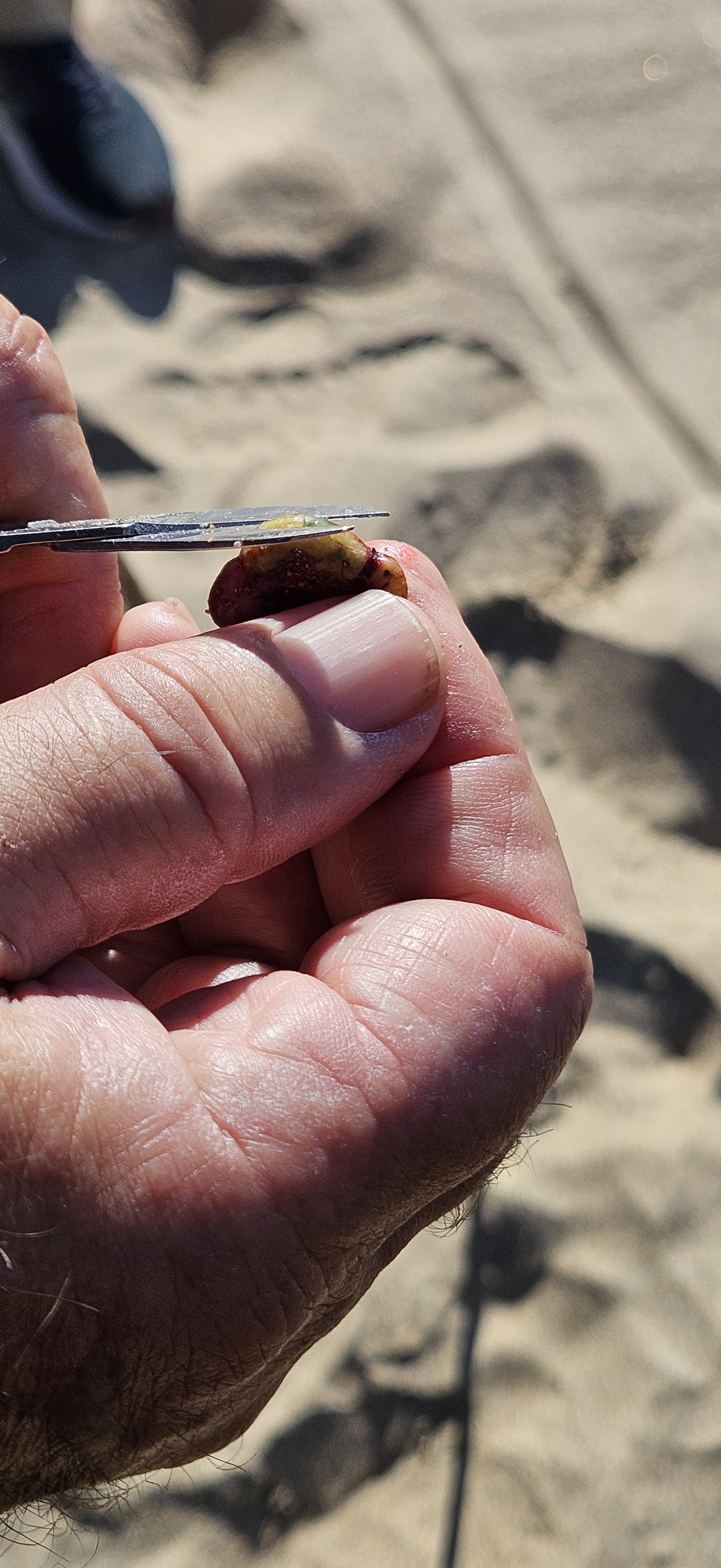 Further up, on the dunes, we encountered a fresh mystery: signs of predator-prey dynamics. Among several feline tracks, there was an impression of a cat sitting on its haunches, with tracks just in front of it and a small organ—roughly the size of my thumbnail. The organ, a liver, was dark red, while the stomach had a greenish hue and contained partly digested sea rocket seeds. The cat had processed its prey with meticulous precision, much like Garth described witnessing a house cat methodically separating unwanted organs from its kill.