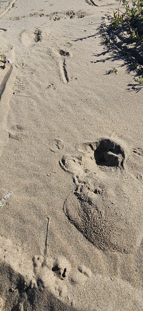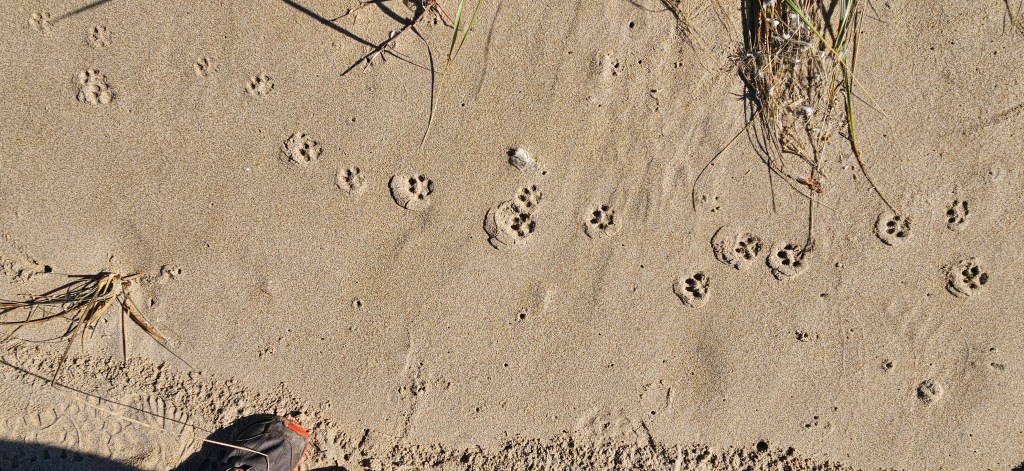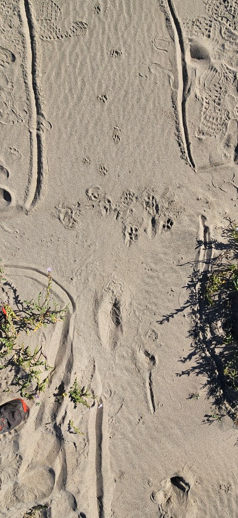 A short distance ahead, we found canine tracks—some with prominent, blunt claws—suggesting they might be from our original scat maker. When we stepped onto the beach, we were struck by the high tide line, which had deposited piles of debris far up onto the sand. The recent Beaver Moon had created unusually strong tidal forces, sweeping large sections of the beach clean. It was the perfect canvas for animal tracks.